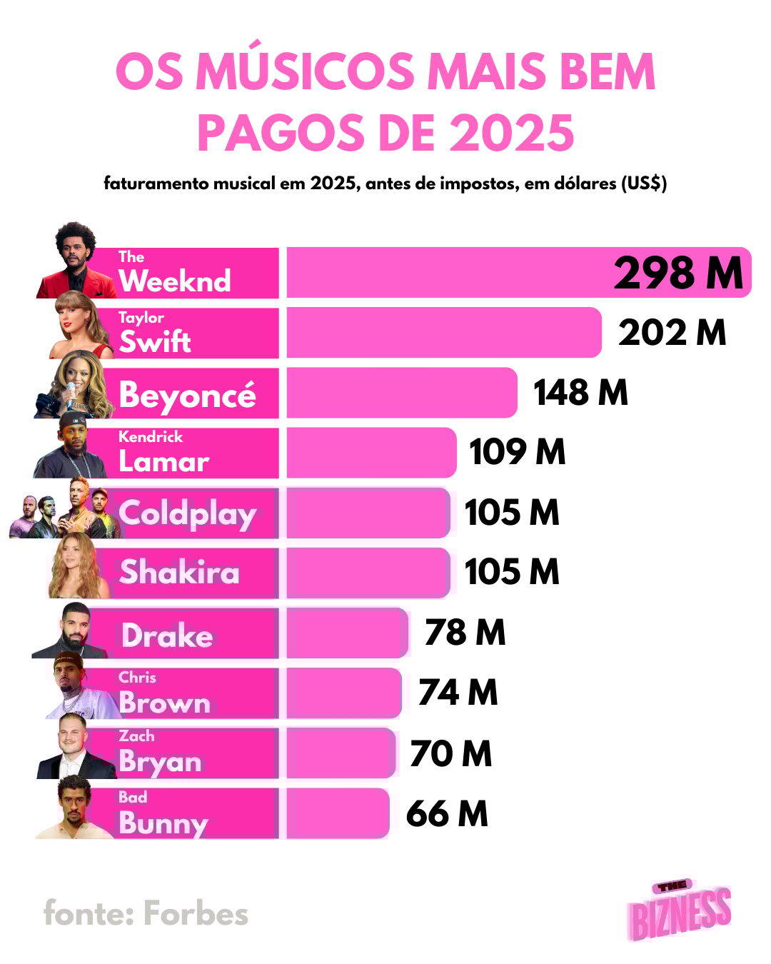 ![]() | 🤑 US$ 1,9 bilhão. Essa é a soma do faturamento dos 25 músicos mais bem pagos de 2025, segundo a Forbes, representando a força comercial dos maiores artistas do planeta. No topo, o canadense The Weeknd puxou o ranking com US$ 298 milhões, impulsionado por uma turnê bilionária e um acordo financeiro inovador envolvendo seu catálogo, seguido por Taylor Swift e Beyoncé, consolidando o domínio das superestrelas globais. |