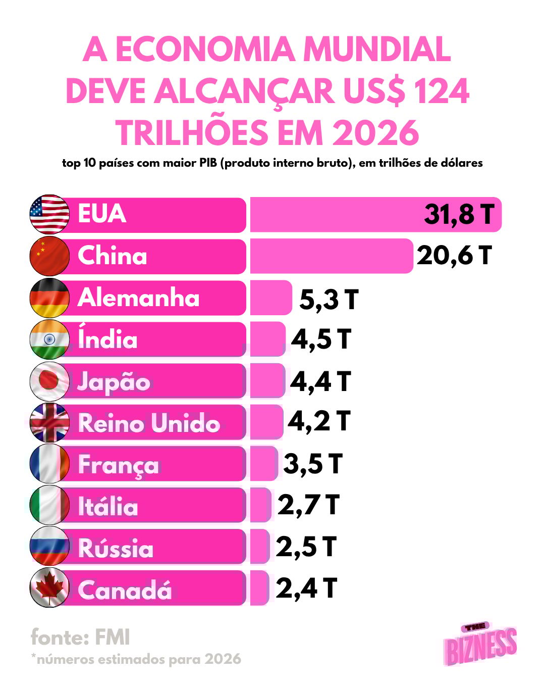 ![]() | 🇺🇸 US$ 31,8 trilhões. Segundo o último relatório do FMI, esse deve ser o valor alcançado pelo PIB americano em 2026 — praticamente a soma de 🇨🇳 China, 🇩🇪 Alemanha e 🇮🇳 Índia juntos. 🇧🇷 E o Brasil? Ficou logo fora do top 10, em 11º, com um PIB estimado em US$ 2,3 trilhões, seguindo como maior economia da América Latina, à frente do 🇲🇽 México e da 🇦🇷 Argentina. Quando o assunto é per capita… O ranking muda completamente. 🇱🇺 Luxemburgo, 🇮🇪 Irlanda e 🇨🇭 Suíça lideram com folga, todos acima de US$ 100 mil por habitante, enquanto o Brasil fica distante desse grupo. |